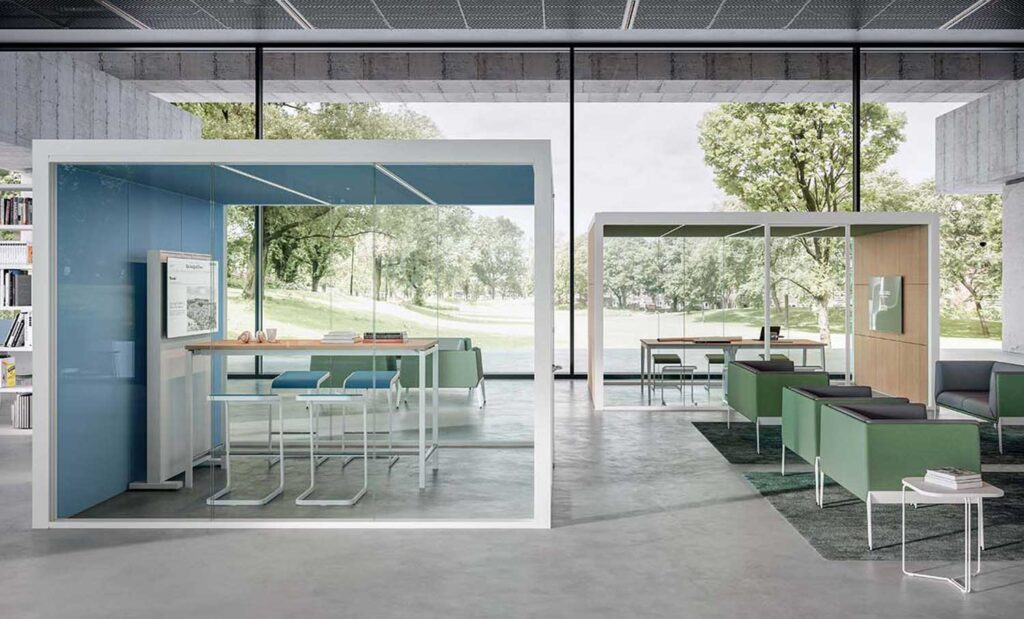Za ustvarjanje dragocenih povezav potrebujemo delovne prostore, kjer je mir in zasebnost zagotovljena. Akustične govorilnice združujejo sodobno oblikovanje z inovativnimi materiali, ki absorbirajo hrup, ter ponujajo prostor za koncentracijo, ustvarjalnost in poglobljene pogovore. Tukaj nastajajo ideje in odnosi, ki ostanejo.